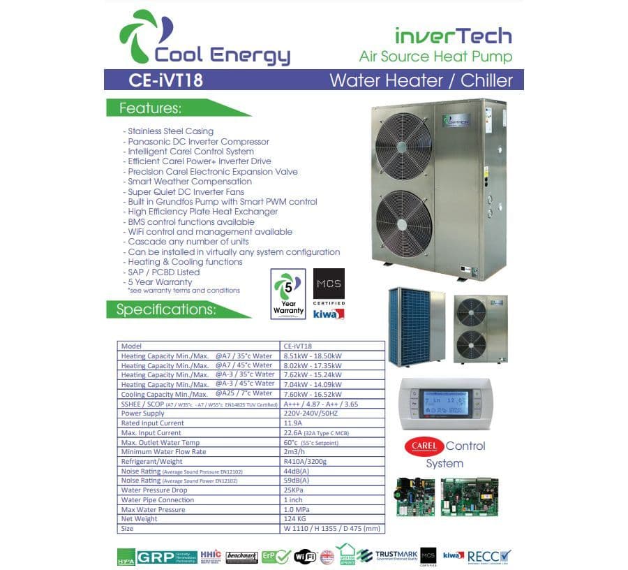 - Cool Energy CE-iVT18 inverTech Air Source Heat-pump Grundfos Pump R32 8.5kW-18.5kW Low noise 220-240V 50Hz single phase