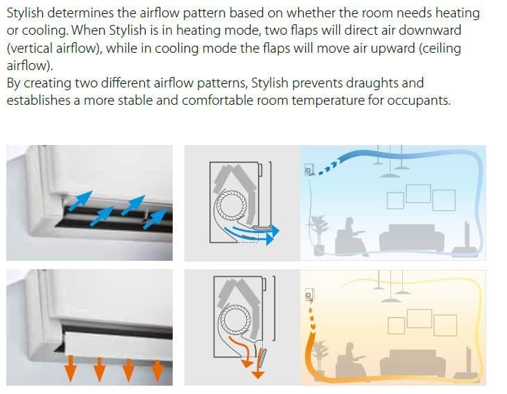 The Daikin Stylish wall mounted unit brings together excellent design and technology to deliver a total climate solution for any interior. Measuring only 189 mm, Stylish is the thinnest unit on the market in the design segment for wall mounted units and uses innovative features to achieve the best in comfort, energy efficiency, reliability and control. Curved corners create an unobtrusive and space saving design. Thin dimensions make it the most compact design unit on the market. Perfect indoor air quality: the flash streamer captures viruses and allergens leaving you with a cleaner indoor environment. Award winning design: Stylish earned the Good Design Award and iF award for its innovative look and functional capabilities.