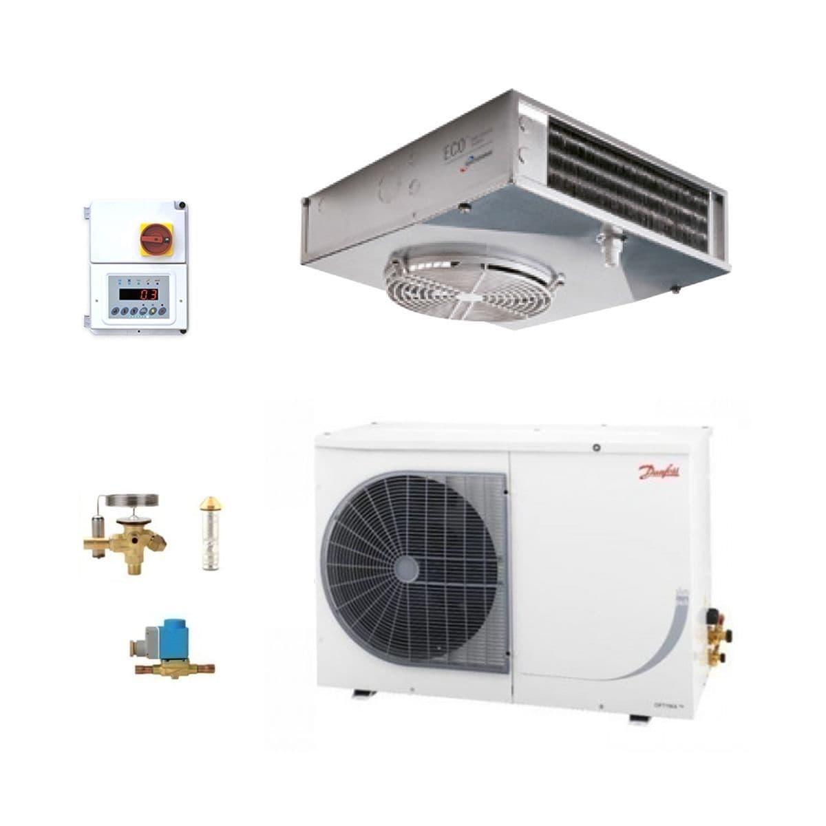 This is a complete refrigeration plant kit for a frozen food holding room with a operating temperature of -21 DegC. This kit contains a Danfoss condensing unit, Eco EVS indoor evaporator, flare nuts, drier, sight-glass, solenoid valve + coil and an electronic controller. This kit is ideal for a freezer cold room replacement or as a new installation.