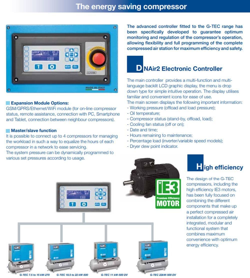 The centrifugal fan design along with the careful arrangement of other components when added to the extensive sound insulation results in the G-TEC offering the lowest operating noise levels available. The advanced controller fitted to the G-TEC range has been specifically developed to guarantee optimum monitoring and regulation of the compressor’s operation, allowing flexibility and full programming of the complete compressed air station for maximum efficiency and safety. The design of the G-TEC compressors, including the high efficiency IE3 motors, has been fully focused on combining the different components that make up a perfect compressed air installation for a completely integrated, modular and functional system that combines maximum convenience with optimum energy efficiency