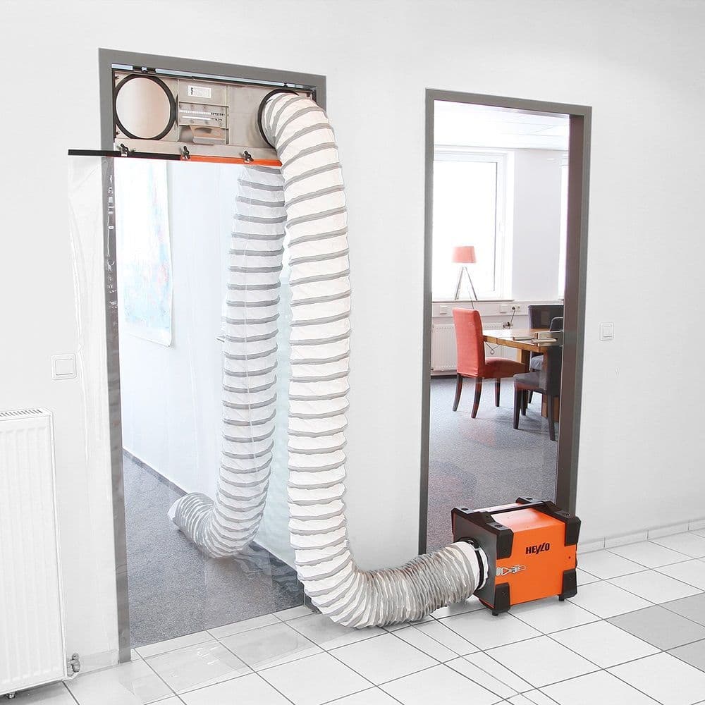 The DCS dust protection system is an innovative, mobile solution designed to enhance air quality and cleanliness in a variety of settings, including buildings and commercial spaces, construction sites, general industry, and areas dedicated to leisure and recreation. At the heart of this system lies the dust protection door (DCD), which offers a rapid and secure method to segregate the clean zones from areas undergoing work or containing dust and debris. Accompanied by a mobile fan positioned within the clean zone, the system efficiently establishes a negative pressure environment in the dusty or renovation space, commonly referred to as the black area. This mechanism effectively prevents the dispersion of fine dust particles into surrounding areas, ensuring a clean and safe environment. By directly routing the hose to the dust's point of origin within the renovation area, the system also achieves targeted dust extraction.