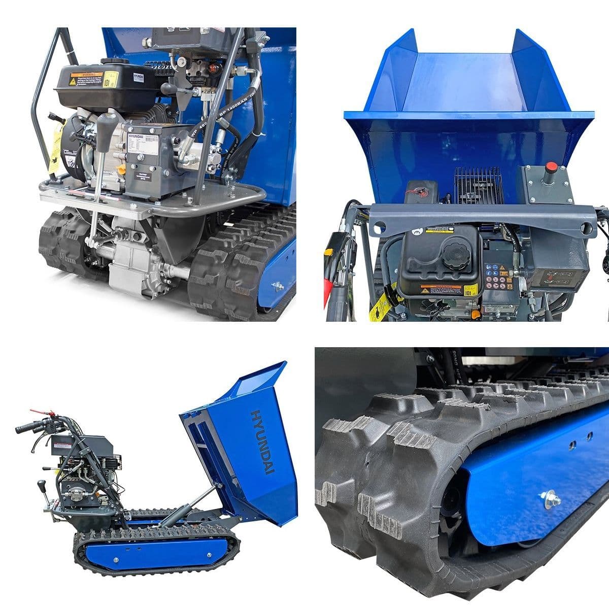 The HYTD500 is a heavy-duty mini dumper with tracked drive system from the Hyundai construction range. Suitable for a wide range of loading and transporting applications including construction sites, agricultural, landscaping, garden and allotment use. The Hyundai tracked dumper can accommodate all kinds of loads on any terrain for numerous applications. The HYTD500 power barrow features manual gear operation with 3 forward and one reverse gear. The drive is controlled by a single lever and left and right track-stop/brake levers for turning make this very manoeuvrable.