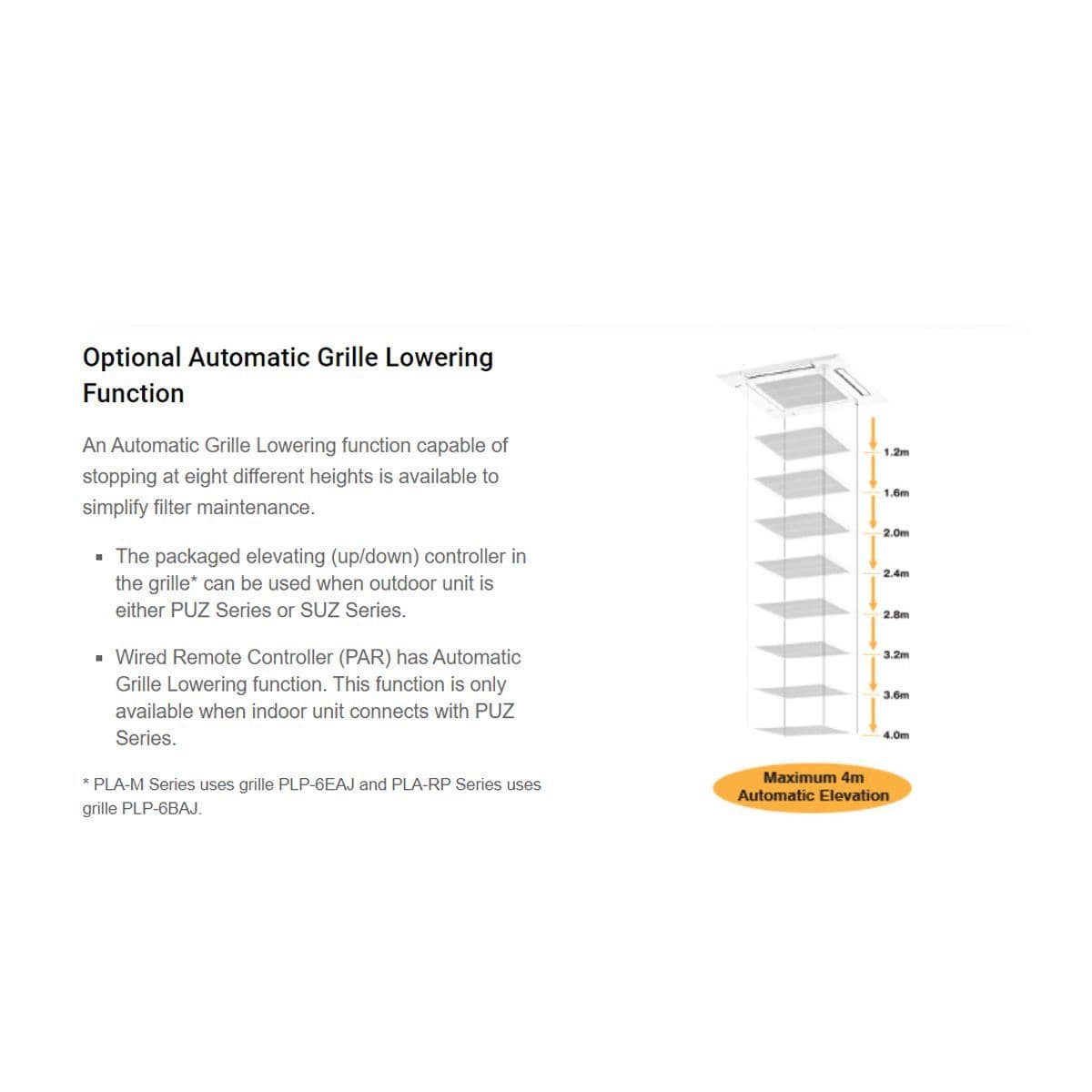 Mitsubishi Electric Air Conditioning Mr Slim PLA Cassette Inverter Heat Pump A+, A++ Home / Air Conditioning / Mitsubishi Electric Air Conditioning / Mitsubishi Electric Air Conditioning Mr Slim PLA Cassette Inverter Heat Pump A+, A++ / Mitsubishi Electric Air Conditioning 296460 PLP-6EAJ Self elevating grille PLA-ZM / PLA-M / PLA-SM Mitsubishi Electric Air Conditioning 296460 PLP-6EAJ Self elevating grille PLA-ZM / PLA-M / PLA-SM Mitsubishi Electric Air Conditioning 296460 PLP-6EAJ Self elevating grille PLA-ZM / PLA-M / PLA-SM £656.20 £546.83 (ex. VAT) Stock Status: In Stock Voltage: 240V~50Hz 415V~50Hz (+£131.75) Information Reviews Mitsubishi Electric Air Conditioning 296460 PLP-6EAJ Self elevating grille PLA-ZM / PLA-M / PLA-SM Automatic Grille Lowering Function An Automatic Grille Lowering function capable of stopping at eight different heights is available to simplify filter maintenance. The packaged elevating (up/down) controller in the grille* can be used when outdoor unit is either PUZ Series or SUZ Series. Wired Remote Controller (PAR) has Automatic Grille Lowering function. This function is only available when indoor unit connects with PUZ Series. * PLA-M Series uses grille PLP-6EAJ and PLA-RP Series uses grille PLP-6BAJ. Not yet reviewed Write an online review and share your thoughts with other shoppers! Be the first to review this product Related Products Daikin Air Conditioning KRCS01-4 Remote Room Mounted Temperature Sensor £74.65 £62.21 (ex. VAT) Hard Wired Mitsubishi Electric air conditioning 289124 PAR32MAA-J Hard Wired Remote Controller £158.48 £132.07 (ex. VAT) Hard Wired Mitsubishi Electric air conditioning PAR31MAA PAR-31MAA controller £135.72 £113.10 (ex. VAT) Daikin Air Conditioning K.RSS Wireless Temperature Sensor With 10 Meter Range £161.84 £134.87 (ex. VAT) Mitsubishi Electric Air Conditioning PAC-YT52CRA Simplified Wired Controller £205.33 £171.11 (ex. VAT) Mitsubishi Electric Air Conditioning AE-200E MNET Network Centralized Controller £3,109.58 £2,591.32 (ex. VAT) Daikin Air Conditioning BRYQ140A Integral 360` PIR Sensor For FCQHG-F Roundflow Decoration Corner Panel With BRC7FA532F IR Controller £389.36 £324.47 (ex. VAT) Daikin Air Conditioning KDDQ50A140 Fresh Air Intake Kit For Up To 20% Fresh Air £271.43 £226.19 (ex. VAT) Daikin Air Conditioning BMS BACnet Interface DMS502A51 £5,674.99 £4,729.16 (ex. VAT) Mitsubishi Electric Air Conditioning 316805 MAC-587IF-E MELCLOUD WiFi Connection Interface £144.22 £120.18 (ex. VAT)