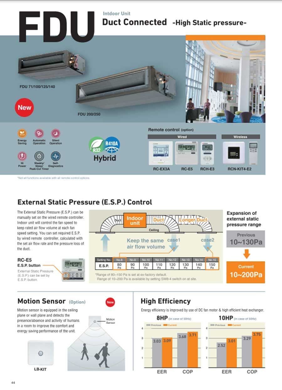 Mitsubishi Heavy Industries Air Conditioning FDU ducted heat pumps for commercial & residential applications. Ideal for concealed cooling, multiple area applications or irregular shaped rooms. FDU Ducted units are of robust construction, and are fitted with large diameter fans for optimum air volume, whilst maintaining low sound levels. Condensate Pump included. Return plenums with filters available as a option for easy installation. Duct design was simplified. Using DC motor, the most optimum air flow volume can be achieved by this automatic control. Indoor unit will recognise external static pressure by itself automatically and keep rated air flow volume. FDU series of slimline ducted systems are a quiet and discreet solution for multiple rooms. Coming in a range of capacities ranging from 7.1kW up to 14kW and incorporating a range of convenient features and functions, the FDU series is the perfect heating and cooling solution. Can be also used with the new AirZone multi zone controller.