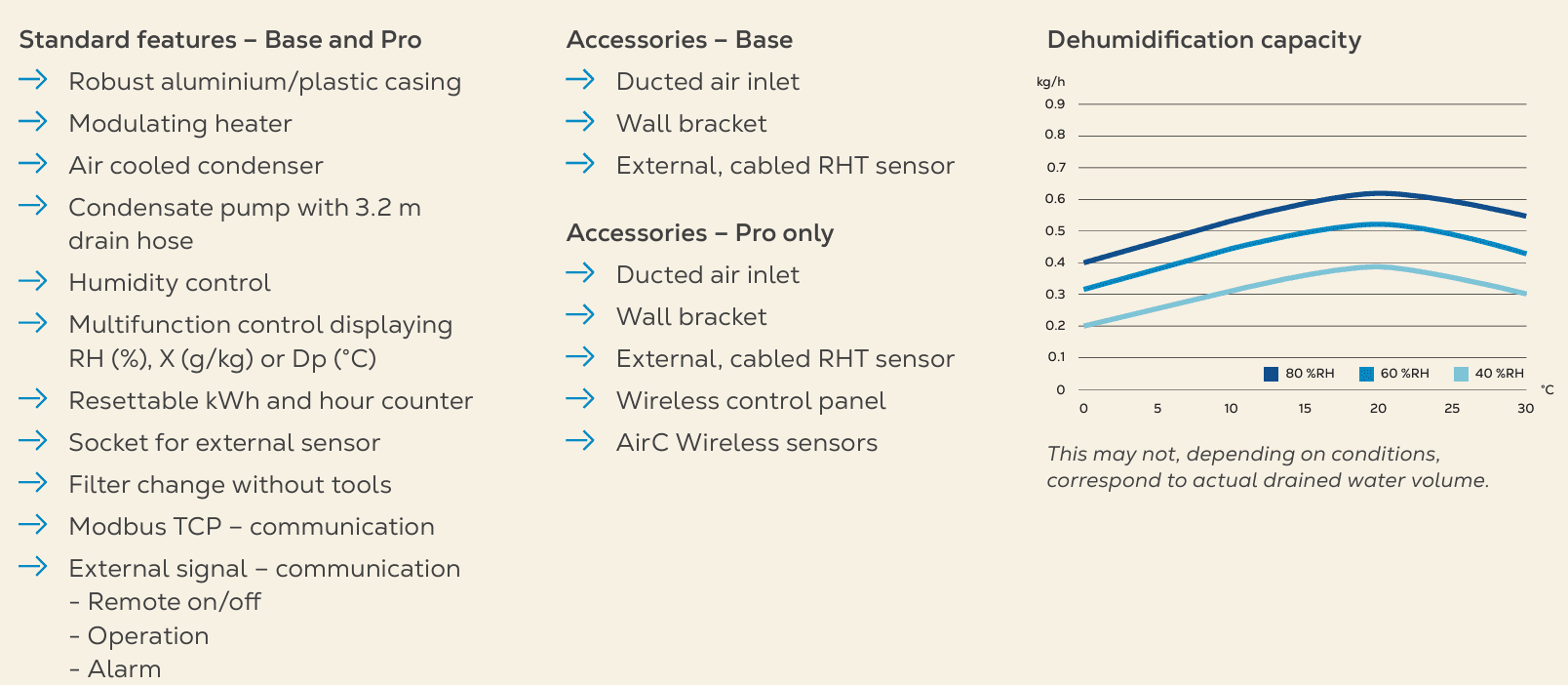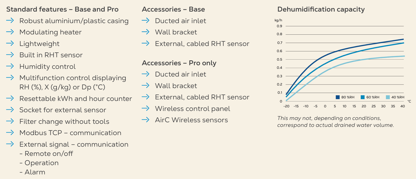The Munters ComDry NX M170L delivers exceptional performance with its combination of energy efficiency, advanced technology, and flexible functionality. Its lightweight construction and integrated condensate pump make it ideal for mobile applications, while its durable casing ensures long-term reliability in demanding environments. With user-friendly controls and the option for advanced remote operation, the M170L is a practical and effective solution for diverse humidity control needs.