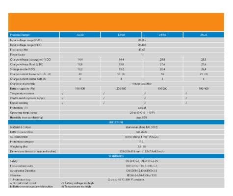 Microprocessor Controlled Battery Charger Home / Garage Equipment / Batteries AGM, Gel Lithium, OPZV and OPZS / Battery Chargers / Microprocessor Controlled Battery Charger / Victron Phoenix 12V 50A Battery Charger Victron Phoenix 12V 50A Battery Charger Victron Phoenix 12V 50A Battery Charger £789.55 £657.96 (ex. VAT) Stock Status: In Stock Information Reviews Victron Phoenix 12V 50A Battery Charger Adaptive 4-stage charge characteristic: bulk – absorption – float – storage The Phoenix charger features a microprocessor controlled ‘adaptive’ battery management system that can be preset to suit different types of batteries. The ‘adaptive’ feature will automatically optimise the process relative to the way the battery is being used. The right amount of charge: variable absorption time When only shallow discharges occur (a yacht connected to shore power for example) the absorption time is kept short in order to prevent overcharging of the battery. After a deep discharge the absorption time is automatically increased to make sure that the battery is completely recharged. Preventing damage due to excessive gassing: the BatterySafe mode (see attached) If, in order to quickly charge a battery, a high charge current in combination with a high absorption voltage has been chosen, the Phoenix charger will prevent damage due to excessive gassing by automatically limiting the rate of voltage increase once the gassing voltage has been reached (see the charge curve between 14,4 V and 15,0 V attached). Less maintenance and aging when the battery is not in use: the Storage mode (see attached) The storage mode kicks in whenever the battery has not been subjected to discharge during 24 hours. In the storage mode float voltage is reduced to 2,2 V/cell (13,2 V for 12 V battery) to minimise gassing and corrosion of the positive plates. Once a week the voltage is raised back to the absorption level to ‘equalize’ the battery. This feature prevents stratification of the electrolyte and sulphation, a major cause of early battery failure. To increase battery life: temperature compensation Every Phoenix charger comes with a battery temperature sensor. When connected, charge voltage will automatically decrease with increasing battery temperature. This feature is especially recommended for sealed batteries and/or when important fluctuations of battery temperature are expected. Battery voltage sense In order to compensate for voltage loss due to cable resistance, Phoenix chargers are provided with a voltage sense facility so that the battery always receives the correct charge voltage. Universal 90-265V AC input voltage range and also suitable for DC supply (AC-DC and DC-DC operation) The chargers will accept a 90-400V DC supply Computer interface Every Phoenix Charger is ready to communicate with a computer through its RS-485 data port. Together with our VEConfigure software, which can be downloaded free of charge from the website www.victronenergy.com and the data link MK1b (see accessories), all parameters of the chargers can be customised. The chargers can also be connected to VENet, the new power control network of Victron Energy, or to other computerised monitoring and control systems. Not yet reviewed Write an online review and share your thoughts with other shoppers! Be the first to review this product